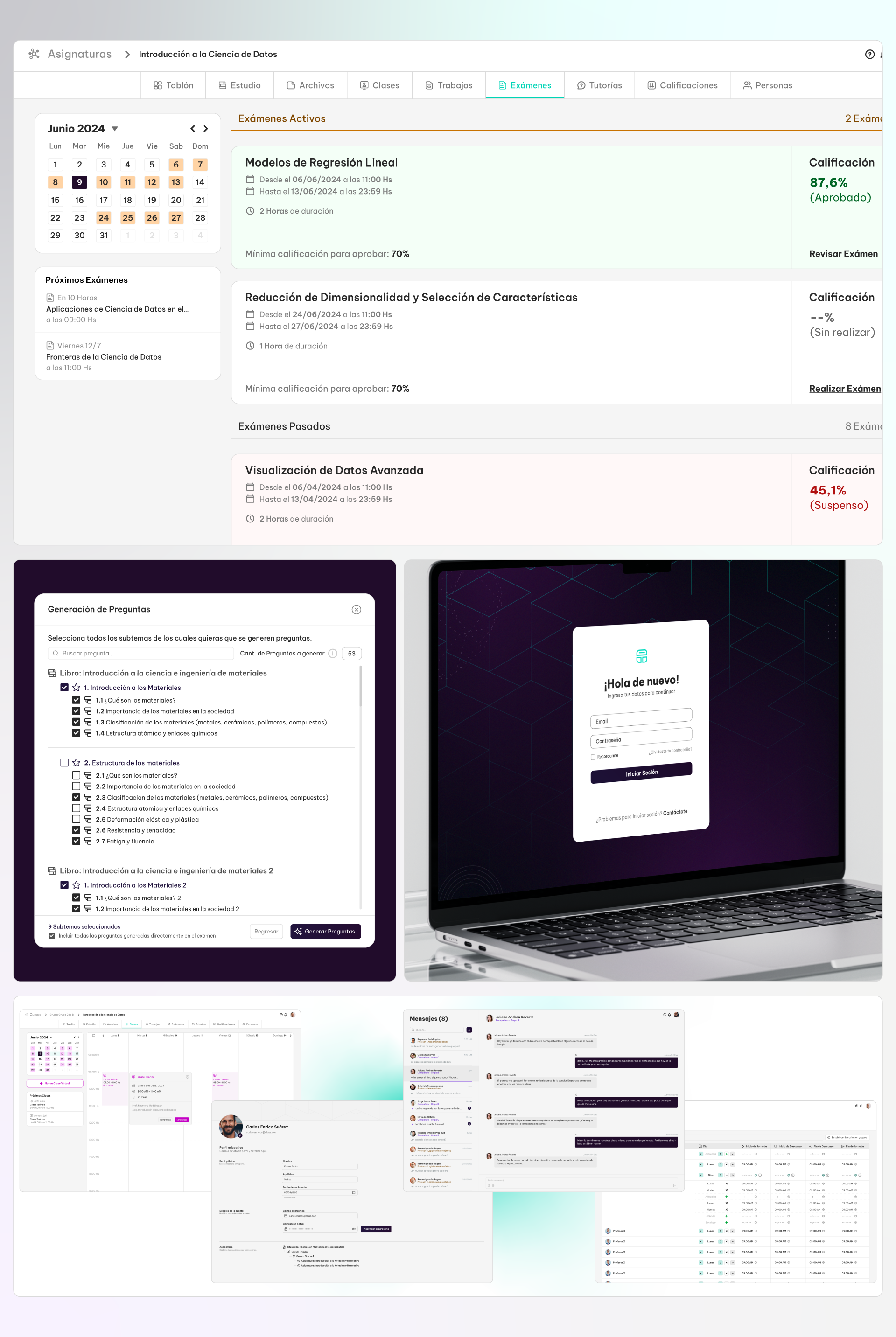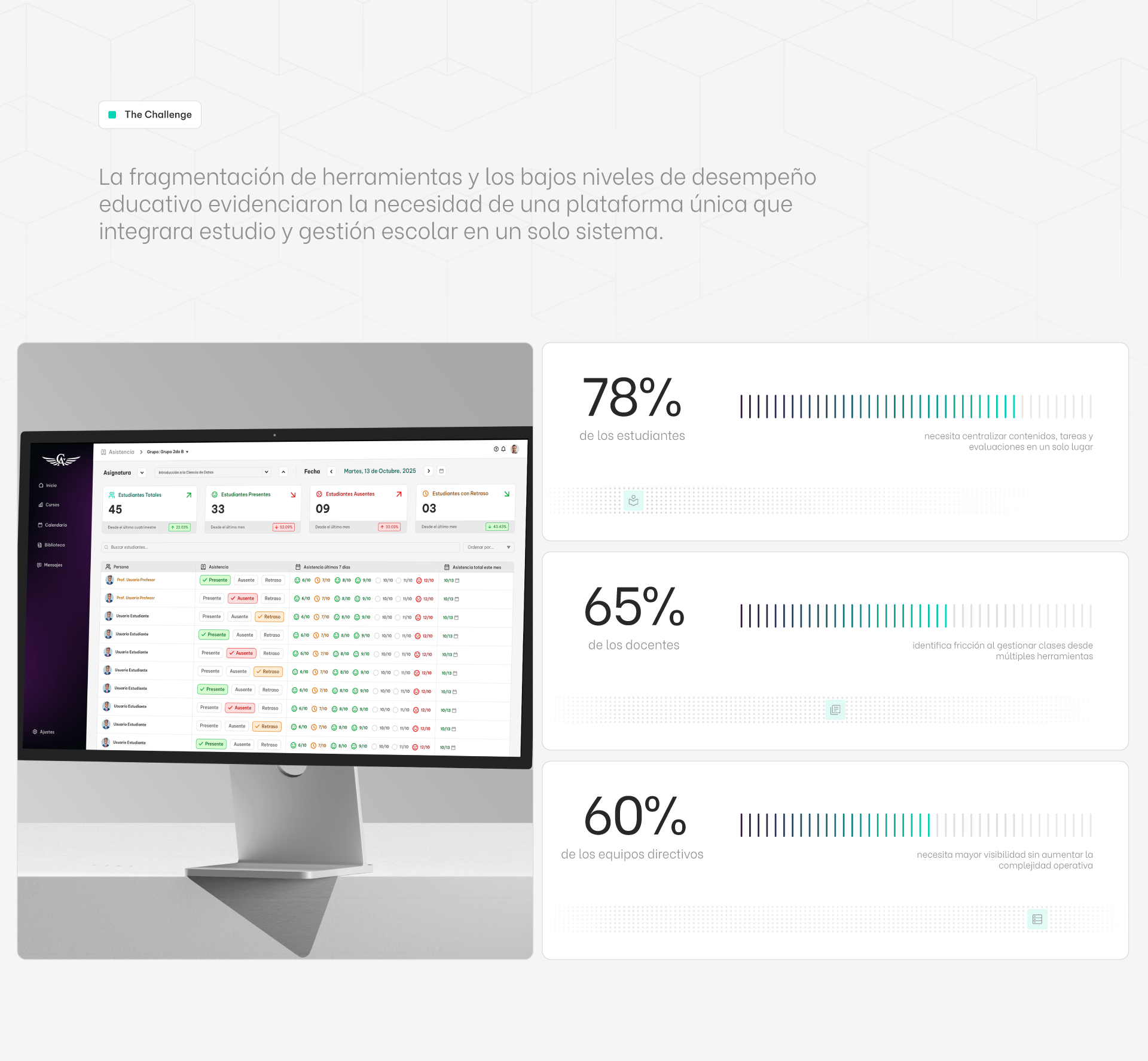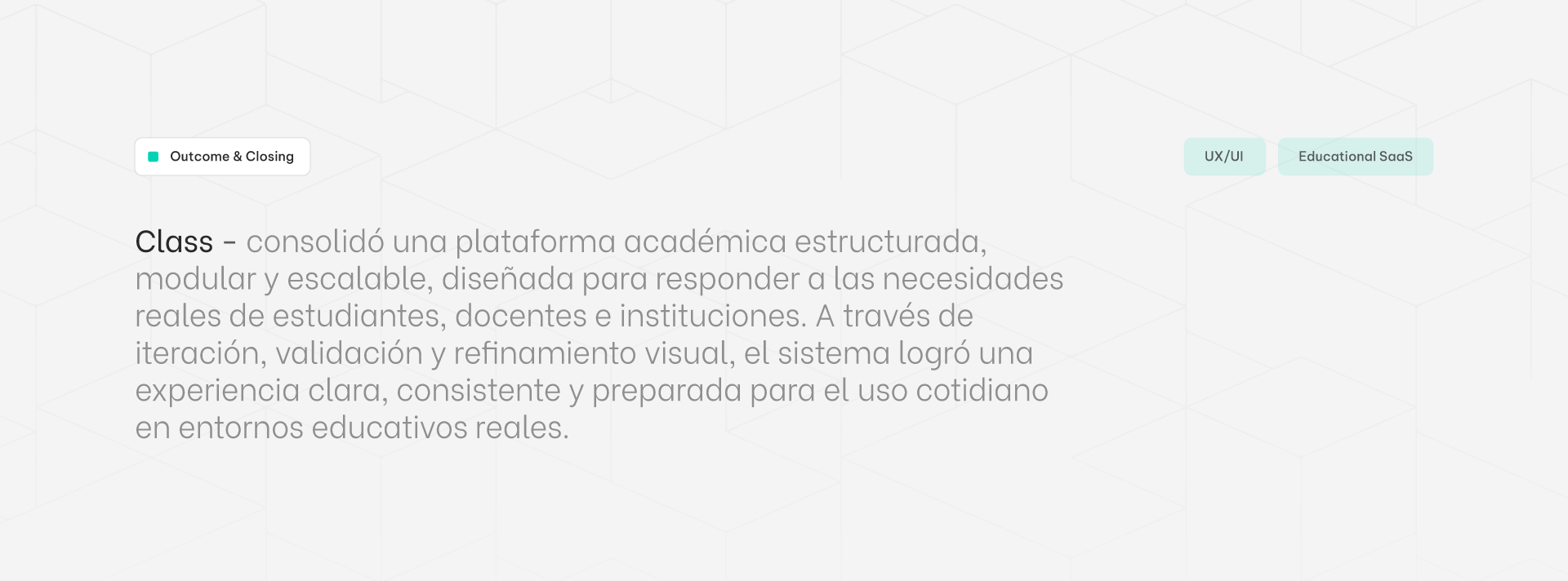 Class es una plataforma web de gestión educativa diseñada para acompañar el trabajo diario de docentes, estudiantes y equipos directivos en contextos reales de enseñanza. El producto aborda la complejidad propia de los entornos educativos: múltiples roles, gran volumen de información, tareas recurrentes y necesidades muy distintas según el perfil de usuario. El desafío principal fue diseñar una experiencia clara, consistente y escalable, capaz de sostener una gran cantidad de pantallas sin perder coherencia ni usabilidad.