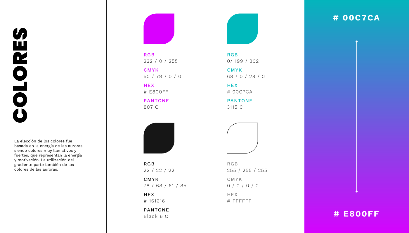 Aurora is an organized team with a defined way of working: we chart a path for each project, approaching it with energy and motivation. We began the creation of our brand by representing a bridge made of wooden planks, symbolizing our defined path. The arrangement of the shapes suggests leadership, and the edges of the rectangles evoke the minimalist essence of a polar aurora. Our identity is filled with vibrant cyan and magenta, reflecting the essence of an aurora and our creative passion.